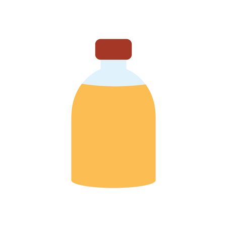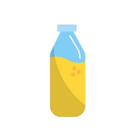 新鮮なスパークリングオレンジジュースの半分が入ったペットボトル。空の青の背景に平らなアイコン。透明な容器に入った黄色い液体。透明の定型化されたベクター 画像eps10イラスト。のイラスト素材・ベクター Image 191484522。
