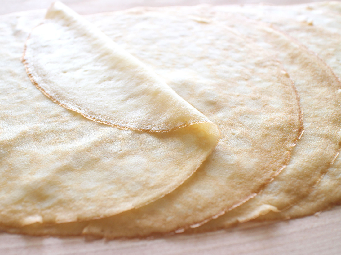 もちもち食感のクレープ生地 溶かしバターと強力粉がポイント。