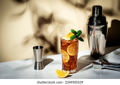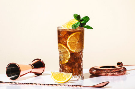 ウォッカ、ラム酒、テキーラ、ジン、酒、レモンジュース、コーラ、氷を添えたロングアイランドアイスティーカクテルに、ハイボールグラスにレモンスライスとミントを添えて。ベージュの背景、ハードライトの写真素材・画像素材Image 198191086。