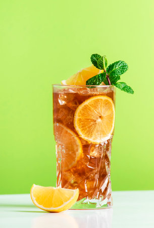 ウォッカ、ラム酒、テキーラ、ジン、酒、レモンジュース、コーラ、氷を添えたロングアイランドアイスティーカクテルに、ハイボールグラスにレモンスライスとミントを添えて。緑の背景の写真素材・画像素材Image 197165088。