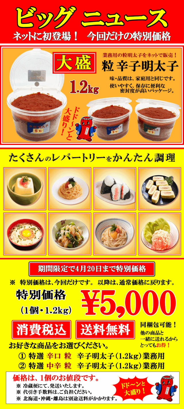 9月の目玉商品 大盛 特選切子辛子明太子 消費税込。