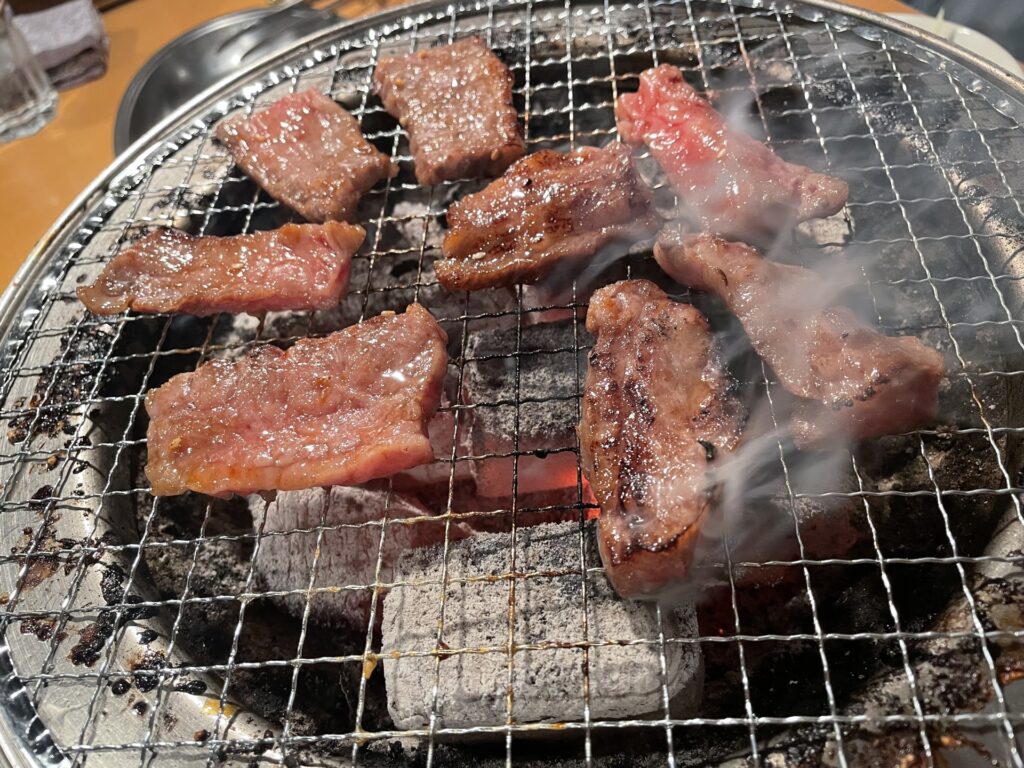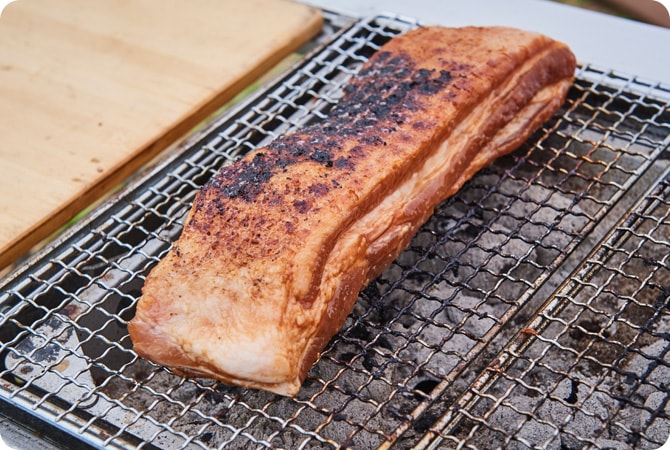 炭火でBBQ豚バラブロックを炭火で網焼きにする。