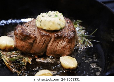 ミディアムレアのフィレミニョンステーキとハーブガーリックバターPremium写真。