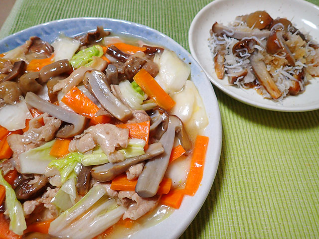 ヌメリササタケの八宝菜とシラスおろし魚ココロあれば水ココロあり。