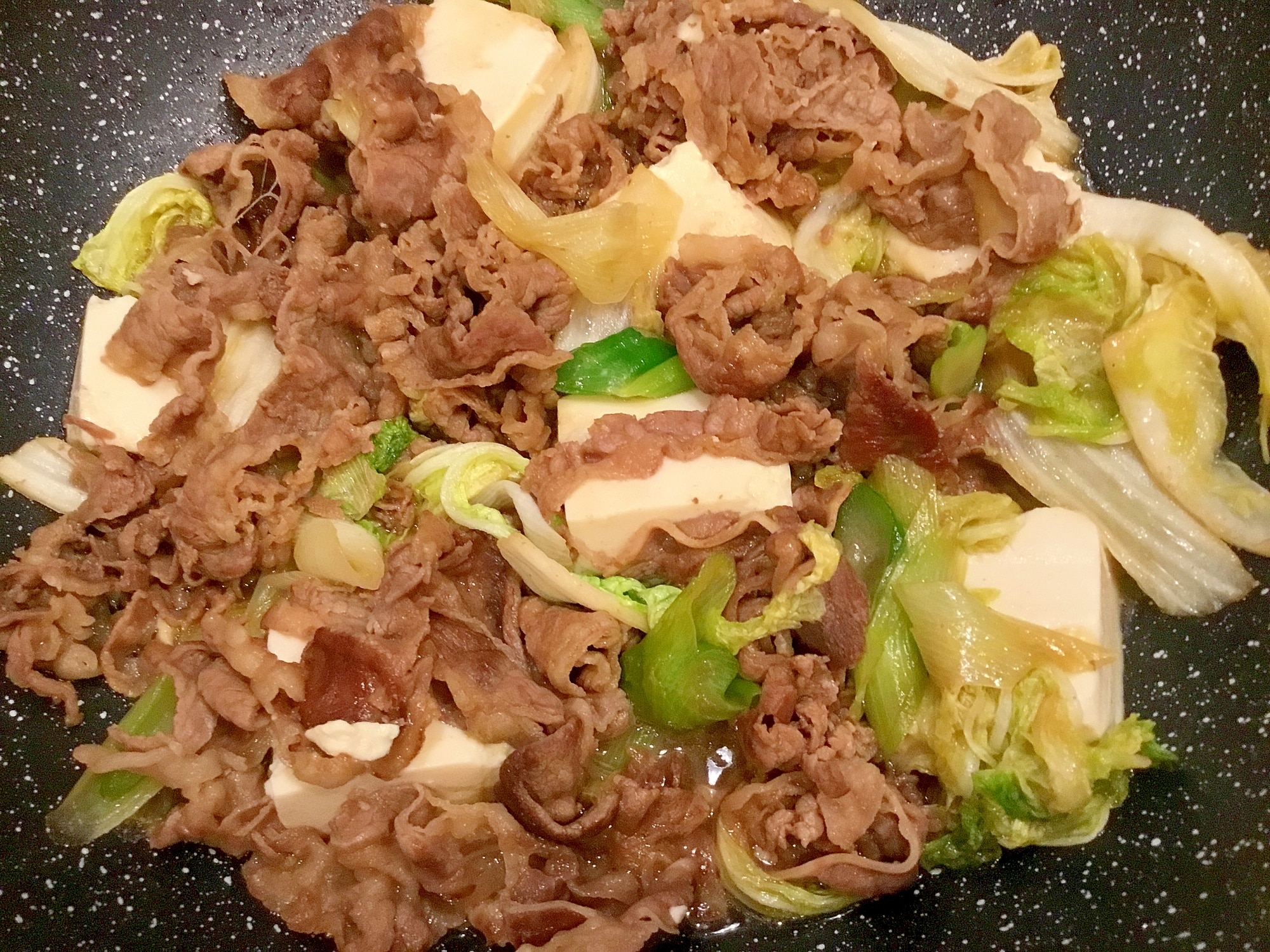 牛肉白菜焼き豆腐白葱で!すき焼き風肉豆腐。