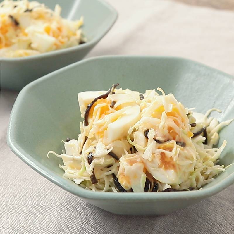 材料4つで ゆで卵とキャベツの塩昆布マヨサラダ。