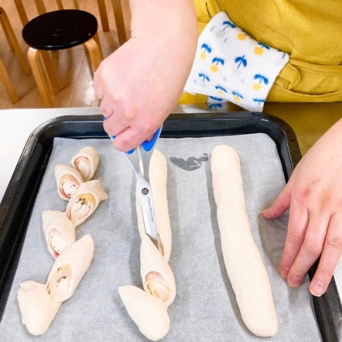 ベーコンエピの成形後のカットの様子です✨, エピとはフランス語で, 「麦の穂」を意味します🌾, 窯入れ前に生地をカットをすると, エッジの効いた,スタイリッシュなエピになりますが、, 小さなお子さまでも食べやすいよう、, 当店では生地をカットした後に, 二次発酵をかけているので、,穂先が丸みを帯びた形になります。, 子ども好きな店長ならではの, こだわりのポイントです😊,。