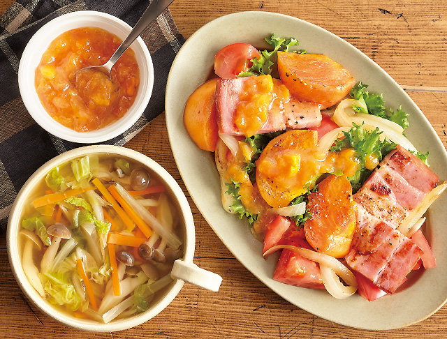 秋を味わう柿とベーコンのおかずサラダ、レンジで簡単! 白菜のコンソメスープeフレンズ ぱくぱく献立くん。