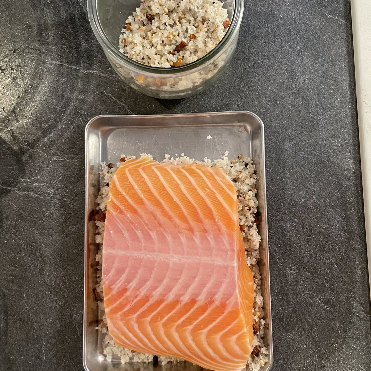 サーモンのハーブマリネ』です。 塩と砂糖で脱水し、粒白胡椒の風味を付け、数種類の生ハーブとオリーブオイルでマリネにしました。粗く刻んだケイパーとオリーブ、にんにくとご一緒にお召し上がり下さい。サーモンハーブマリネサーモンサーモン好きと繋がりたい。