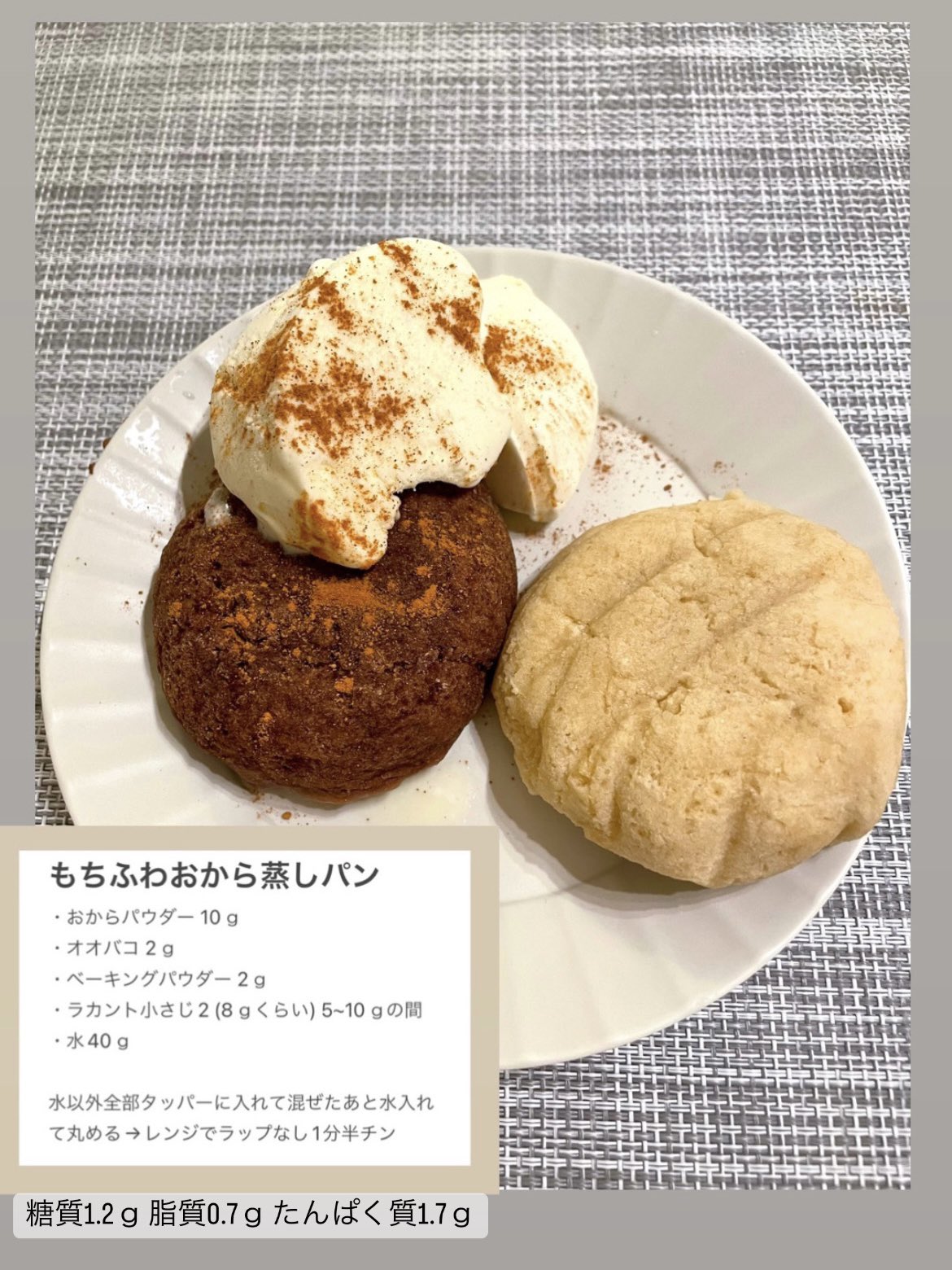 その他のレシピは@mao_recipeから👇🏻 □基本のおからココア蒸しパン 全量156kcal材料・おからパウダー 20g・卵 1個 ・無糖ココアパウダー 8g ・ラカント 20g ・水 90ml ・ベーキングパウダー 3g ①卵をよく溶きほぐす。 ②全ての材料を加え、よく混ぜる。