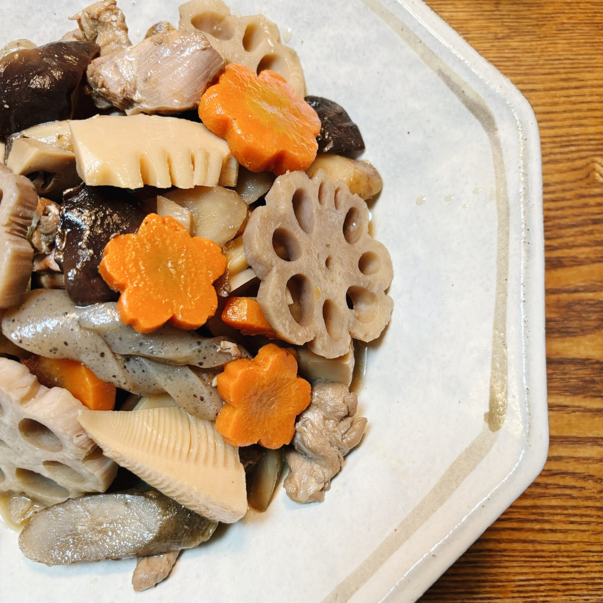 夫が作ってくれた一品 初お披露目ですコロナ禍での恩恵は、 夫の料理の腕前が爆伸びしたこと 結婚してからのレパートリーは、炒飯、焼そばだけだった夫が、 煮物に挑戦なんて奇跡です 以前だったら、ゴボウや、レンコンは、 どう手をつけたら良いのか、 お手上げの食材。