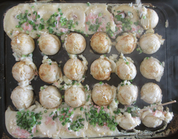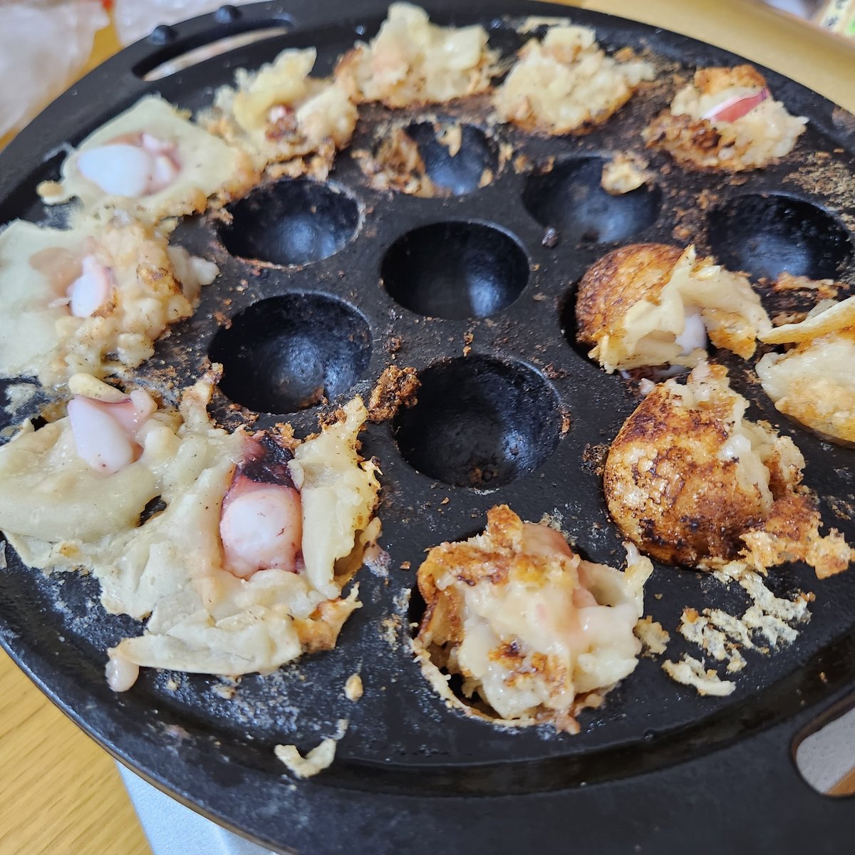 卵焼き器でたこ焼き。,たこ焼き器でくるくるするのがめんどくさかったので、卵焼き器でたこ焼きを作ってみた。ひっくり返すのが大変で中をトロトロにするのもちょっとコツがいるっぽい。次回は改良必至。,コットとかでグリルする方が上も火が入りいいかもね♪,たこ焼き。