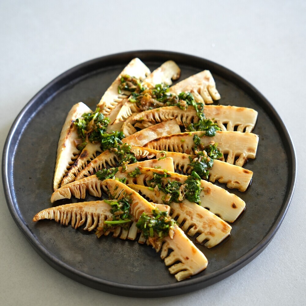 こんがりたけのこの中華風ソースがけ。