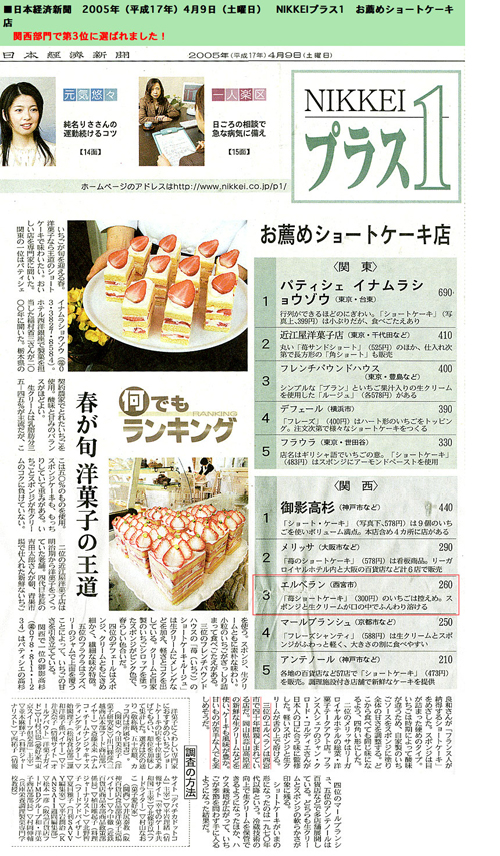 日経新聞「何でもランキング お薦めショートケーキ店」エルベラン。
