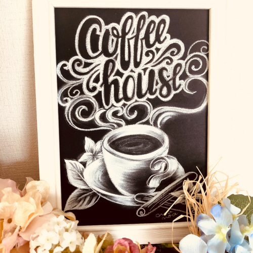 黒板 ブラックボード カフェ コーヒー アート プリント 木製フレーム おしゃれ。