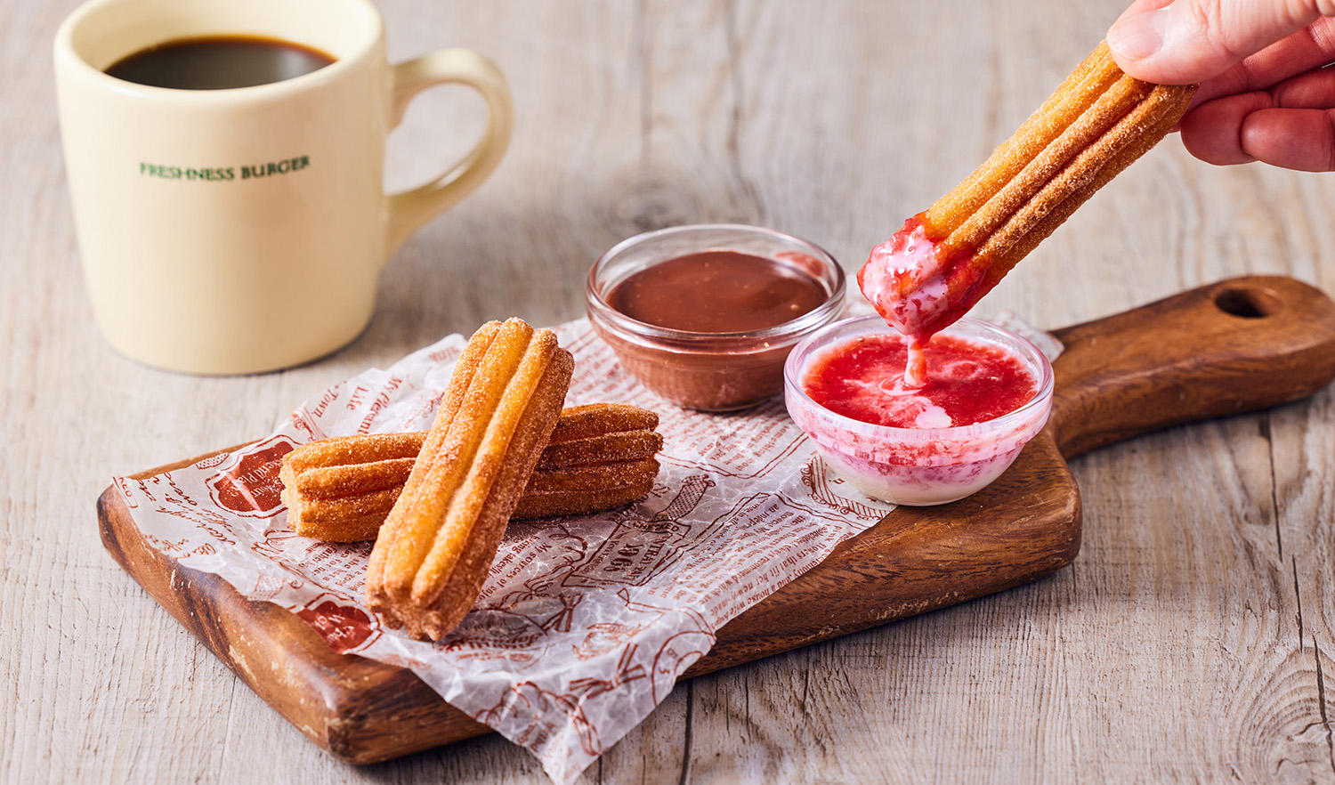フレッシュネスのもちふわ「揚げたてチュロス」に溶け出す生チョコ×甘酸っぱい濃厚いちご練乳の2種ソースが楽しめる新商品登場Emo!miuエモミュ。