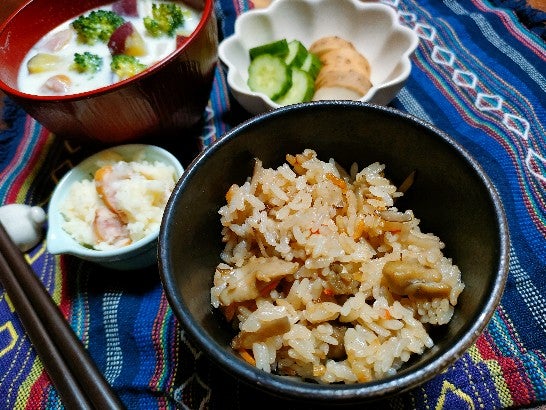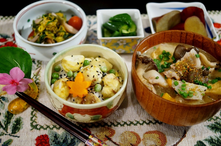 一人晩ご飯 栗ご飯 具沢山豚汁他 新宿お泊まり続編です。 : 「料理と趣味の部屋」。