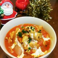 鶏肉と魚介の トマト味噌スープ 今年のクリスマスお味噌汁メニューは 鶏肉と牡蠣や真鱈で寄せ鍋風だけど トマトスープ系のちょっとイタリアンなごちそう感ある一杯でした〜🇮🇹 ◇材料 鶏肉、真鱈、牡蠣、芽キャベツ、 玉ねぎ、しめじ、じゃがいも、 トマトペースト。