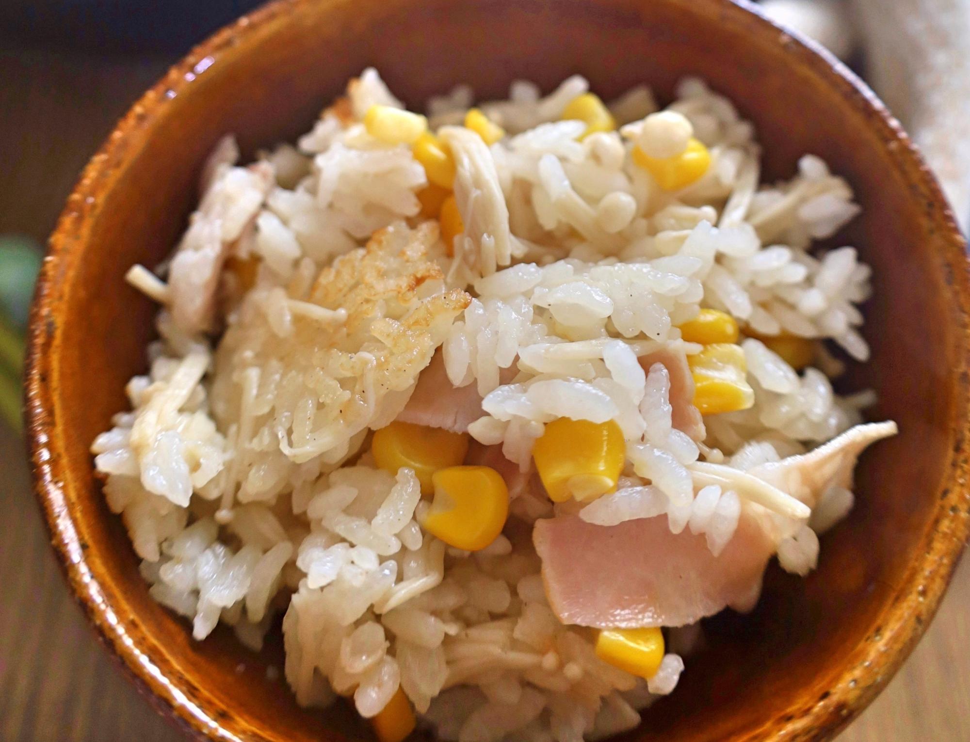 フライパンで絶品!チキンとコーンのミルク炊き込みご飯。