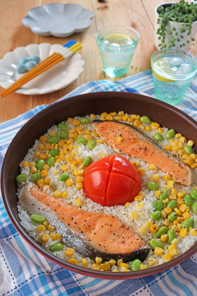 フライパンで簡単!鮭と丸ごとトマトの塩バター炊き込みごはん。
