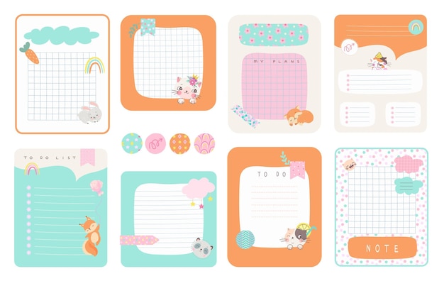 メモ帳テンプレート ページ リスト ノート子供用のメモ帳日記を整理する使用済みステッカー付きのかわいいプランナー デザイン空白のメモ帳またはメモ帳リストページ テンプレート イラストの今のノート ベクトル セットPremiumベクトル素材。
