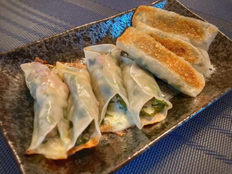 とろ~りチーズがおいしい!「豚バラと大葉のぐるぐる焼き餃子」。