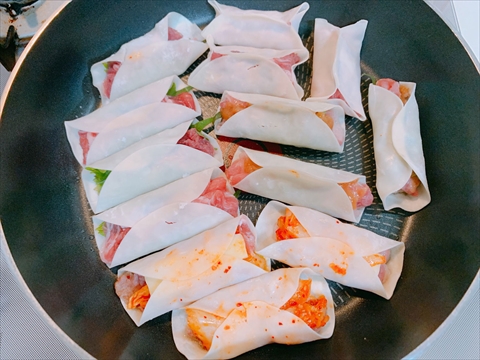 超簡単!豚肉と大葉を餃子の皮で包み焼き。