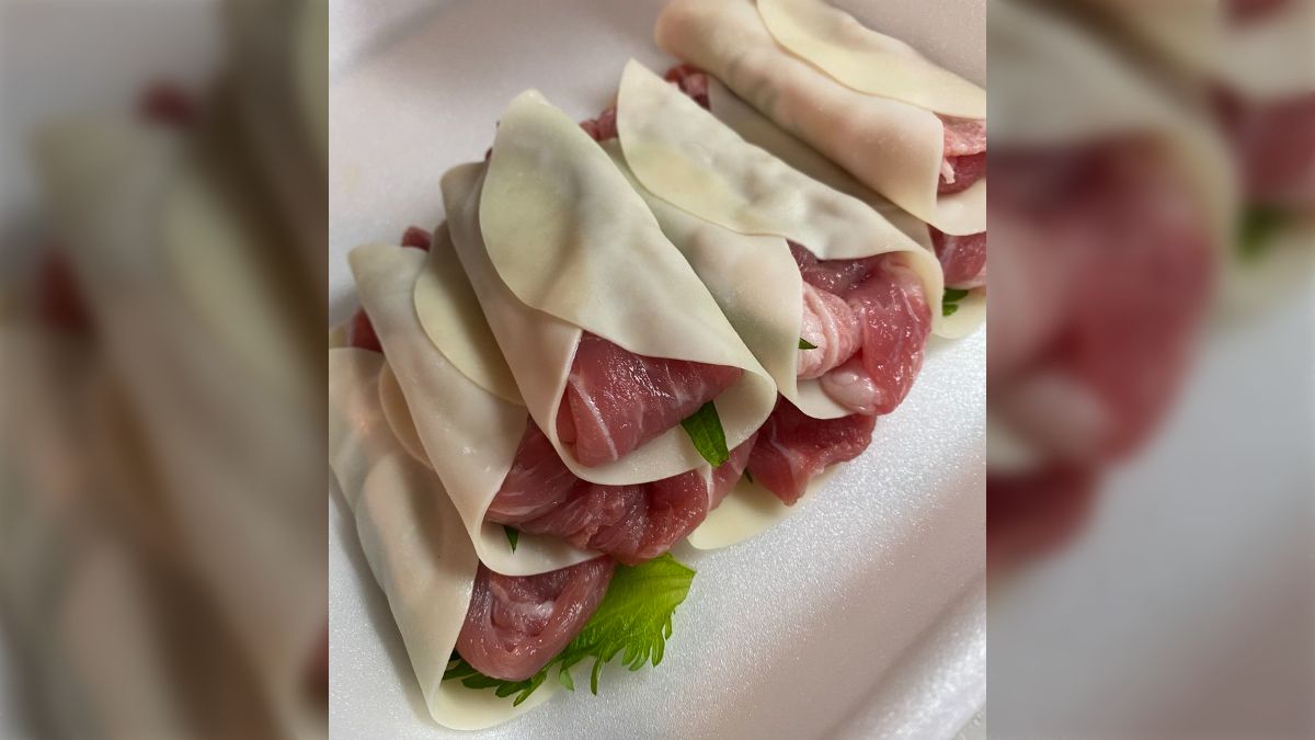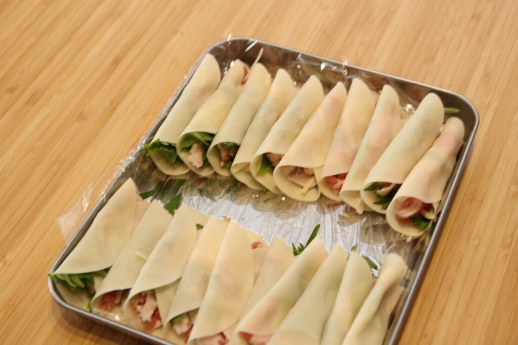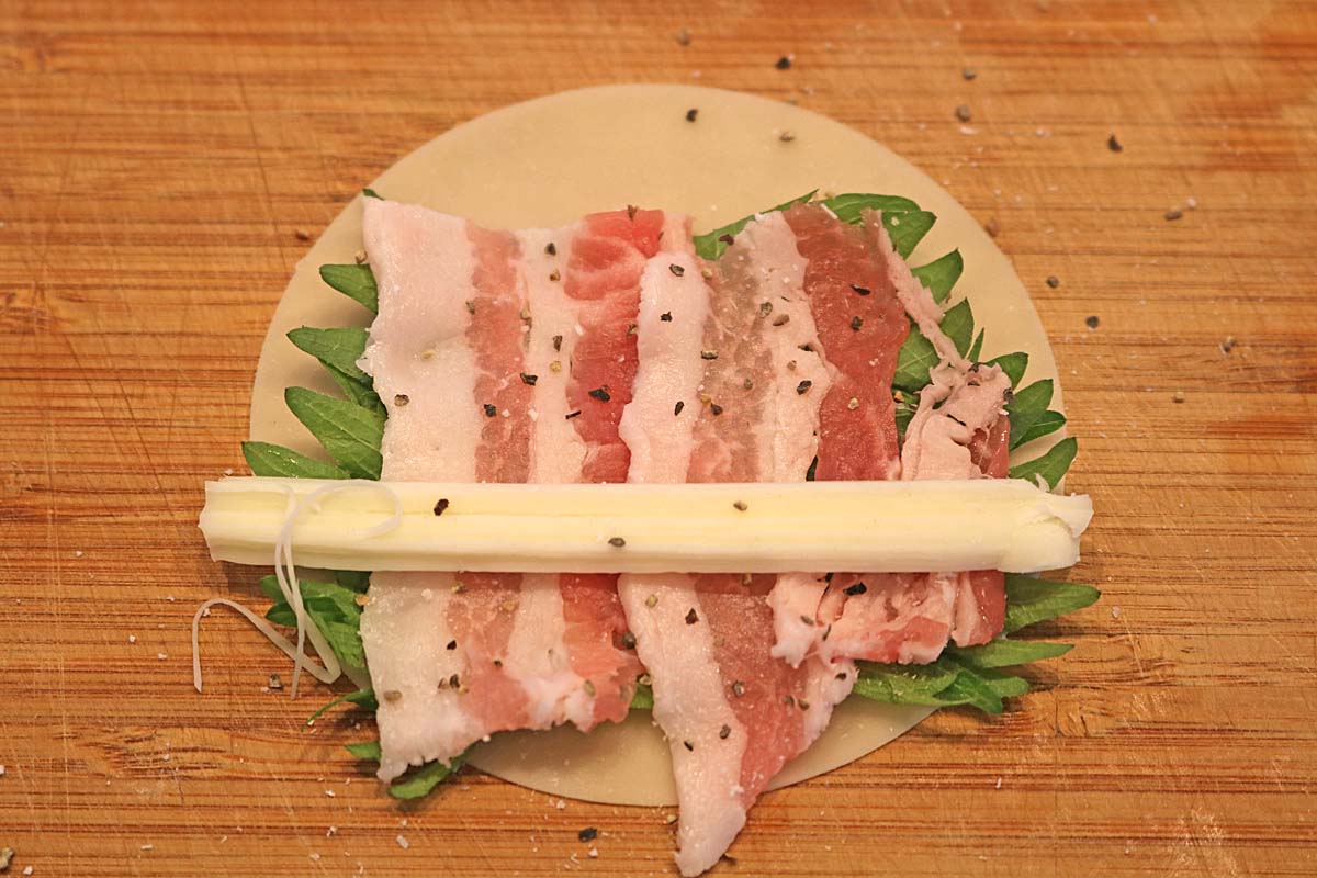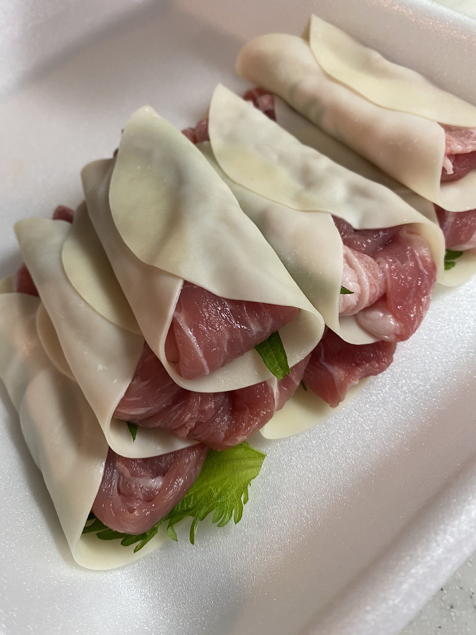 餃子の皮を巻いて完成! 大葉と梅の豚肉巻き。