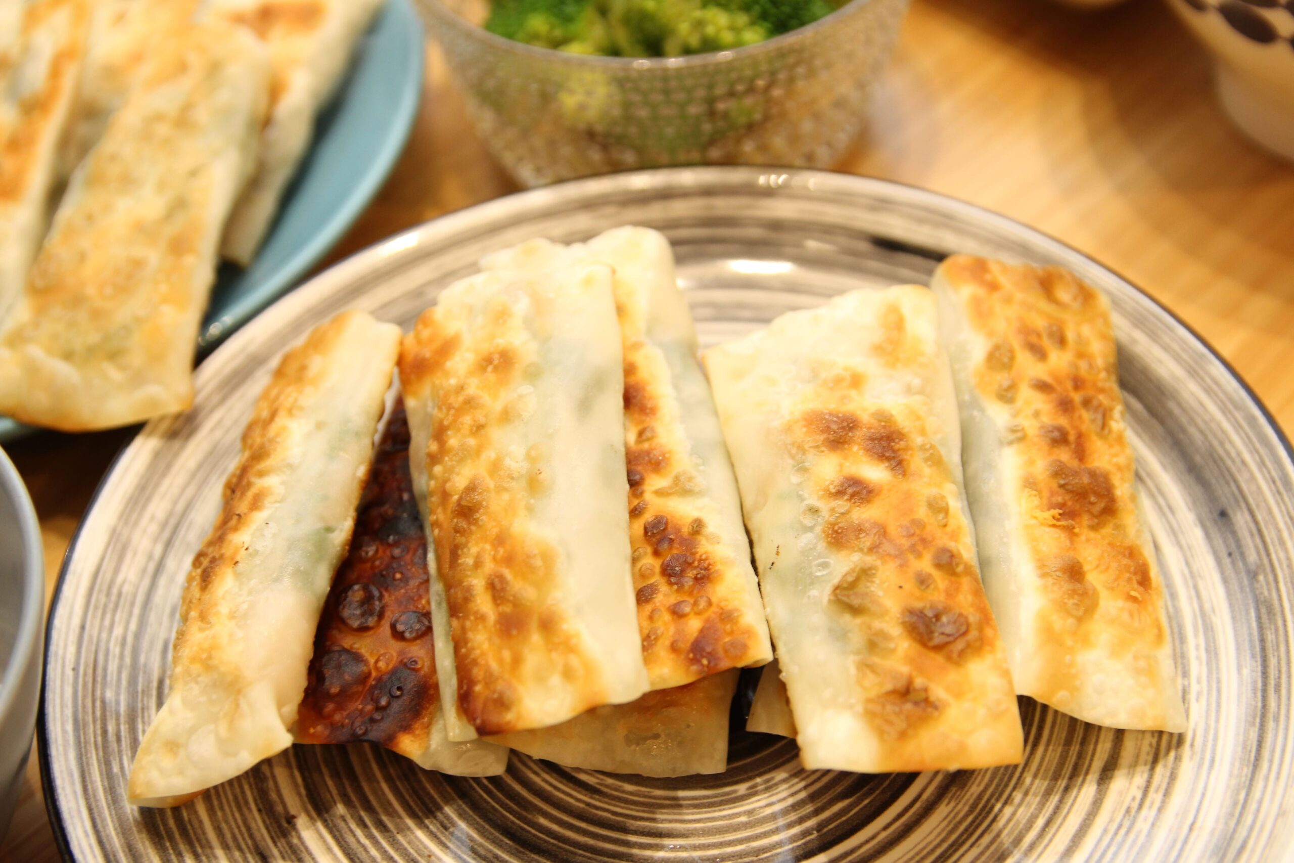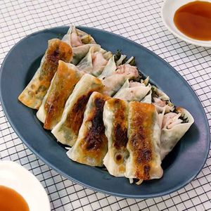 餃子の皮に豚肉と大葉を挟んで焼くだけ!棒餃子より簡単!a dish of gyoza skin wrapped with pork andShiso leaf。