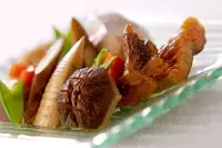 筑前煮<材料 2人分 > 鶏もも肉 1 2枚 150gごぼう 70g ちくわ 2本 にんじん 80g こんにゃく 1 2枚 140gピーマン 1個 油 適量 ☆煮汁 だし 400ml 砂糖 大さじ2 みりん 大さじ2 しょうゆ 大さじ2 <作り方>1.鶏もも肉は筋を切って3cm角に切り、ごぼう。