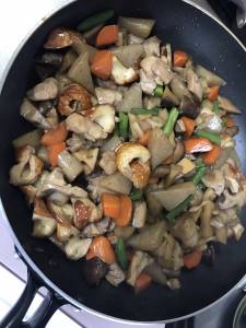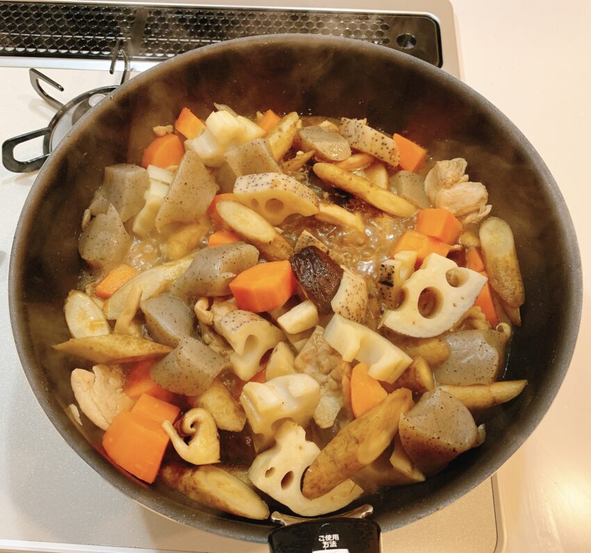 フライパンで煮物 鶏肉と根菜の筑前煮。