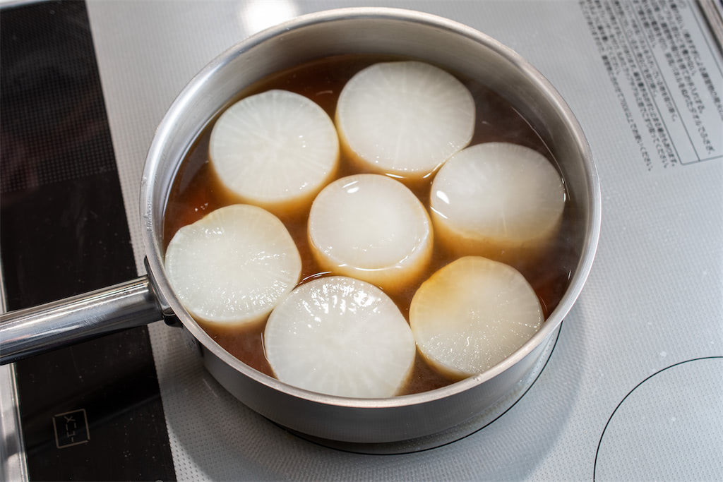 大根の下ゆで方法とコツ 米のとぎ汁でアクを取り除く基本のゆで方煮物レシピと調味料の割合。