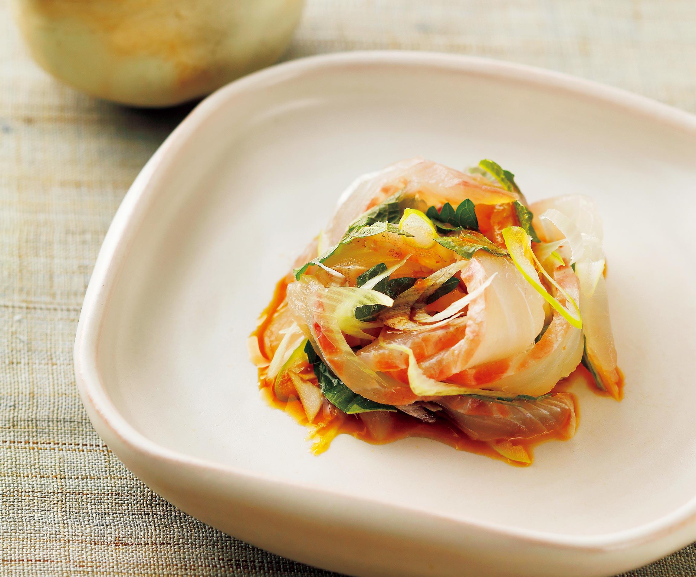 料理レシピ イサキと赤なすのソテー東京築地目利き協会。