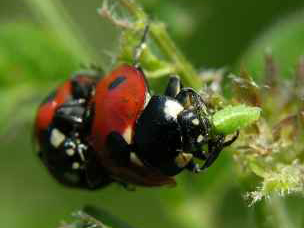テントウムシ:アブラムシを食べるナナホシテントウ。