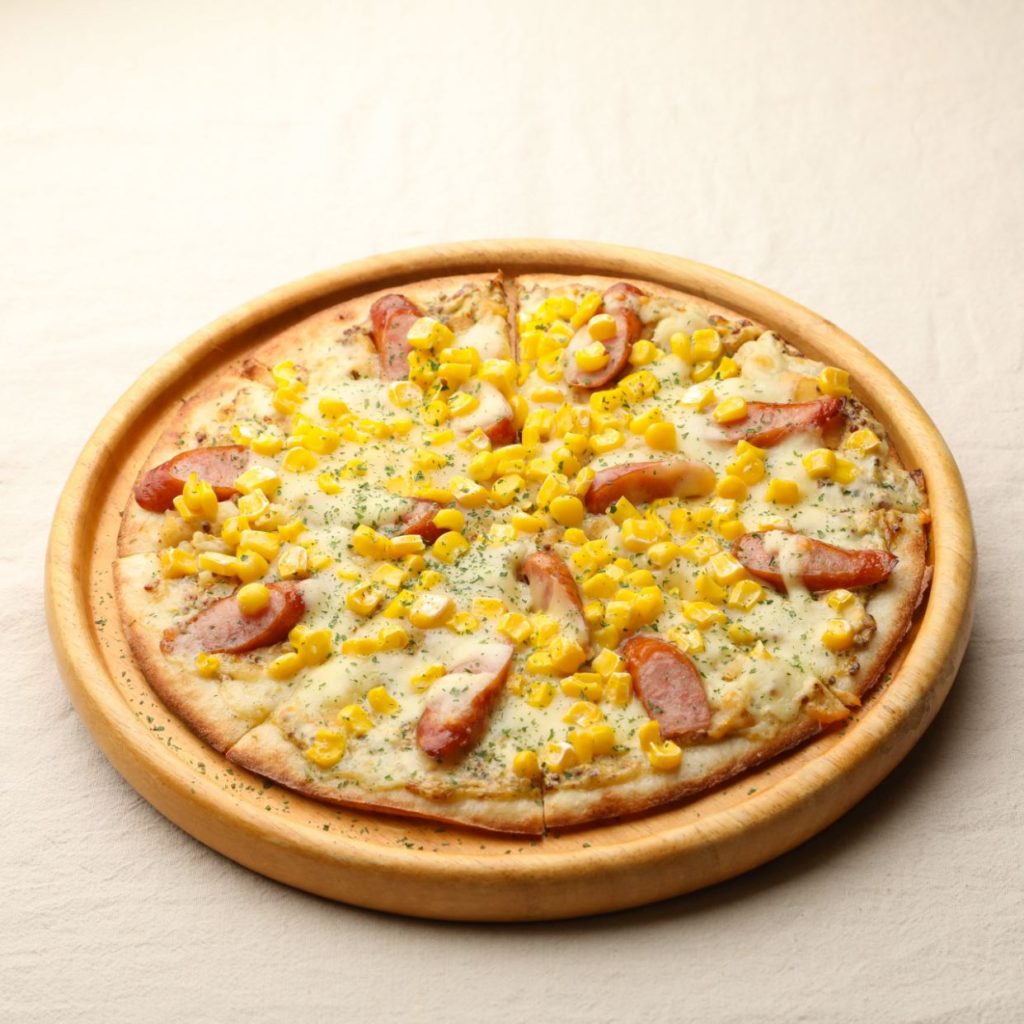 ソーセージとコーンとモッツァレラチーズのピザ。