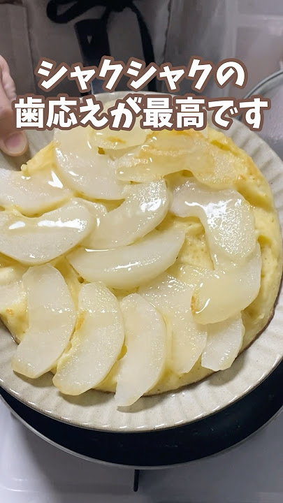 6つの材料で!しっとり梨ケーキ 材料🍐 15cmの丸型梨 1 2個 卵 1個 牛乳 50g 砂糖 30g ホットケーキミックス 150g バター30g ︎︎︎︎☑︎オーブン 180℃使用 ①梨 1 2個の皮をむき、芯を取り除いたら8等分にカットする。 ②ボウルに卵、牛乳、砂糖を入れ、泡立て器。