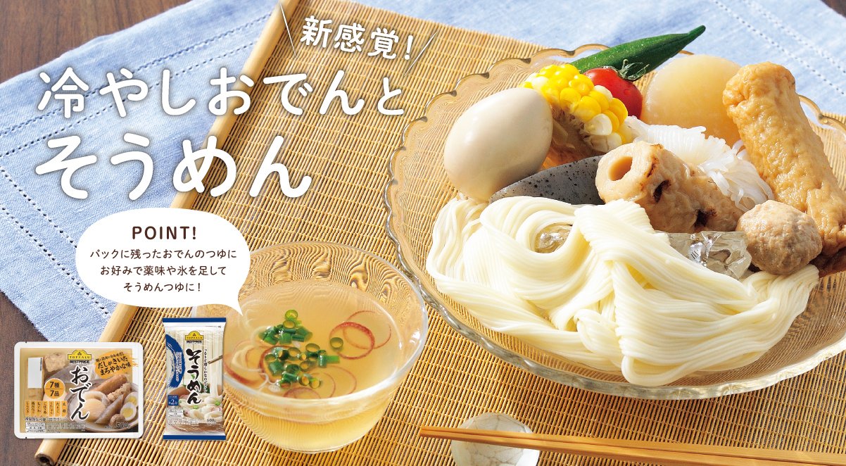 イオントップバリュ on X: "新感覚‼️ 冷やしおでんとそうめん \ おでんを冷蔵庫でよ~く冷やして、そうめんと一緒にどうぞ✨ おでんのパックに残ったつゆは、お好みの薬味や氷を足してそうめんつゆに!鰹と昆布の合わせだしがきいたつゆでさっぱりと召し上がれます。
