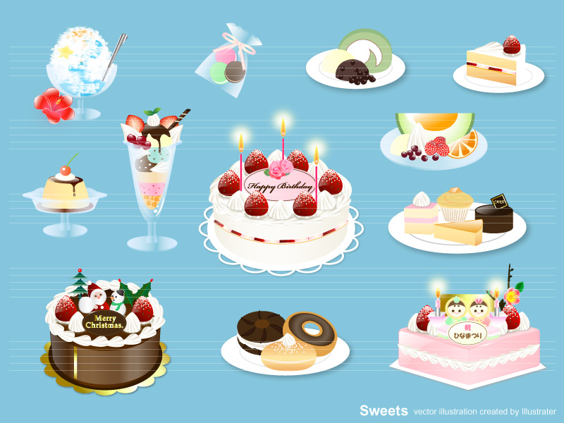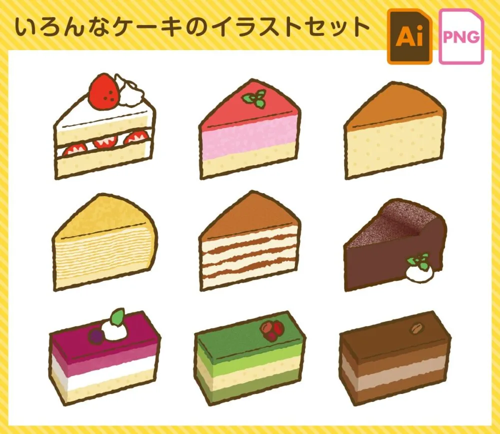 いろんなケーキのイラストセット無料で使えるイラストサイト – フリー素材Illustrator Factory。
