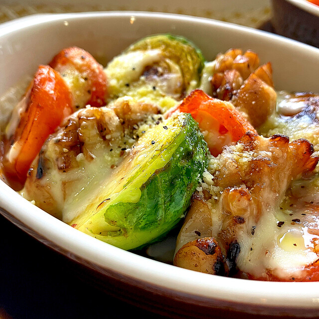 芽キャベツとベーコンのイタリアンチーズ焼。