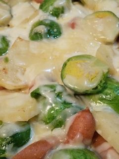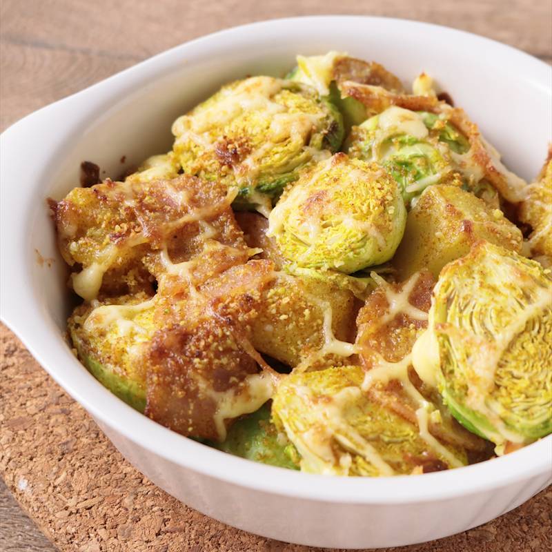 芽キャベツとじゃがいものカレーチーズ焼き。