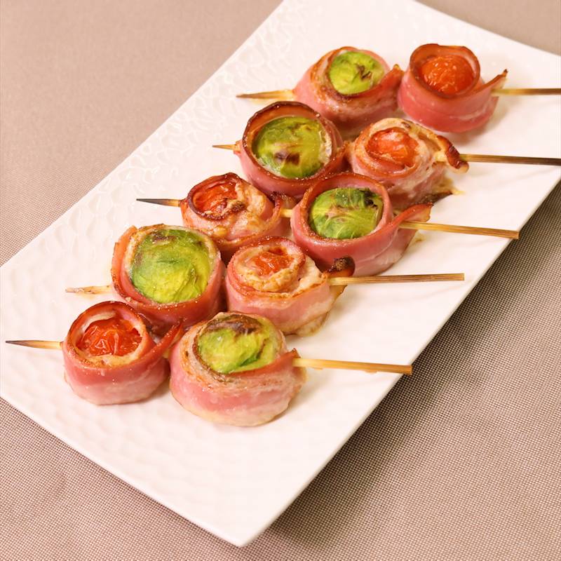 居酒屋風!芽キャベツとトマトのベーコンチーズ巻き。