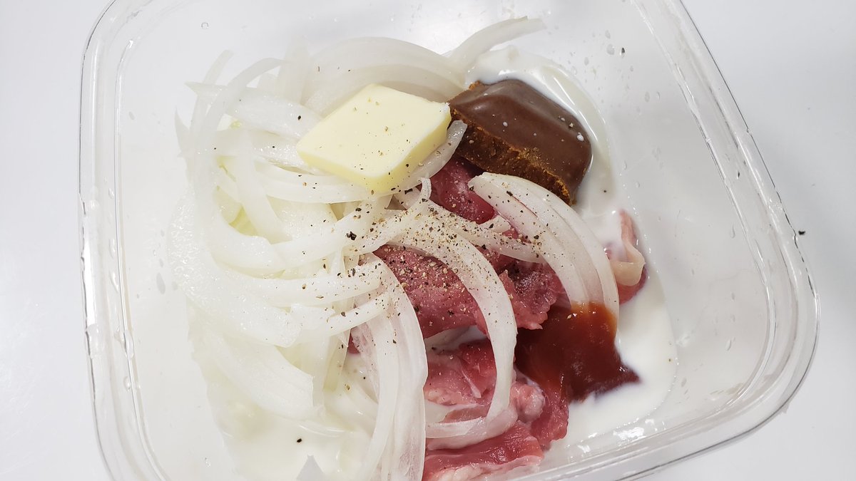 リュウジ@料理のおじさんバズレシピ on X: "少しでも酪農家さんの力になればと「牛乳」でハヤシライス作ったら異常に旨い神の一皿になりました『トマトクリームハヤシライス』 容器に玉葱1 4個、牛肉80g、牛乳90cc、バター5g、ケチャップ小1、ハヤシルー1片、塩、黒胡椒。