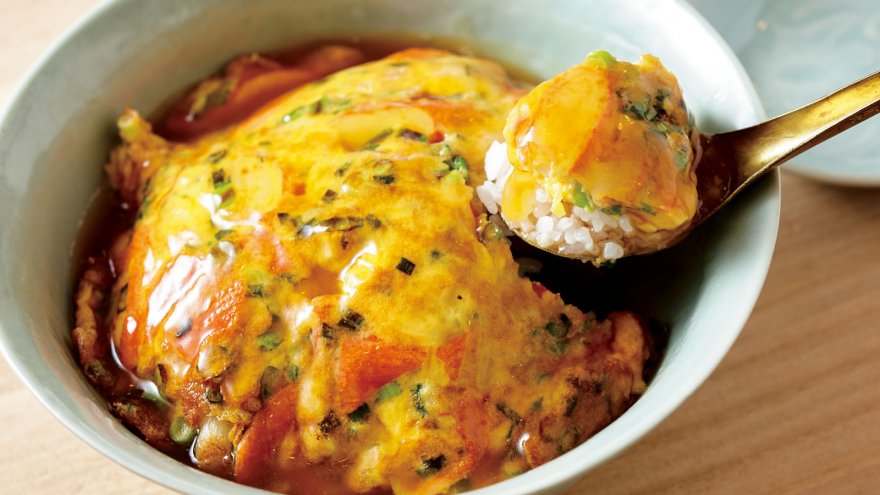 かに玉丼 レシピ蟹缶オムレツ丼・トマト餡かけ。