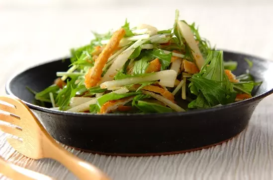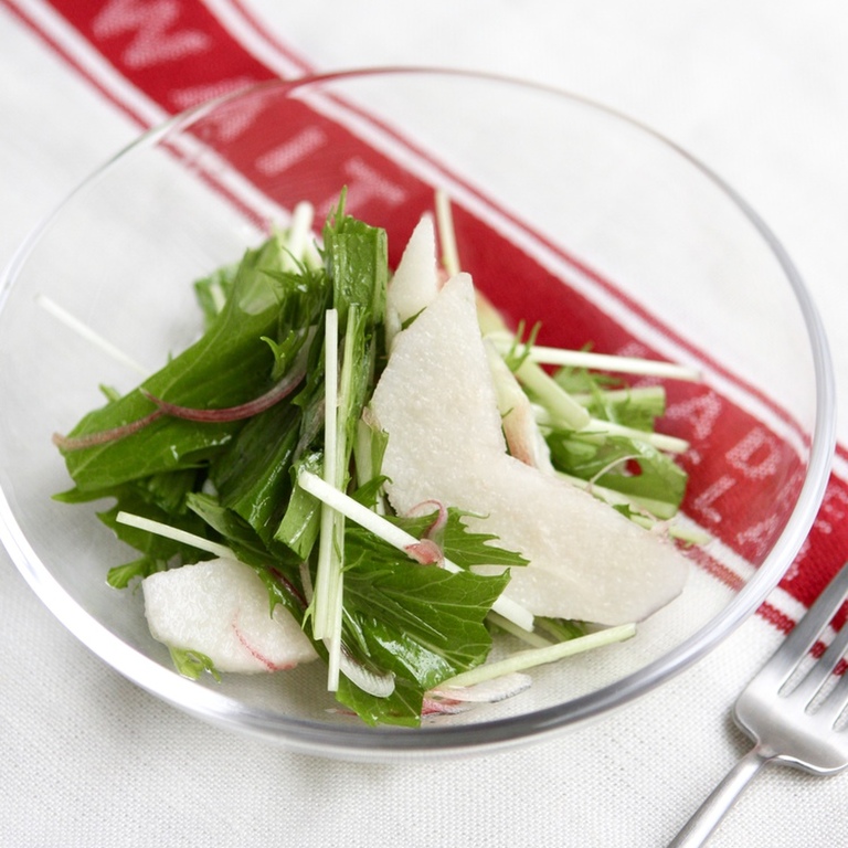 レシピ 旬の果物編:のどの乾燥や空咳を和らげる「水菜と梨のサラダ」セラピストプラス医療介護・リハビリ・療法士のお役立ち情報。