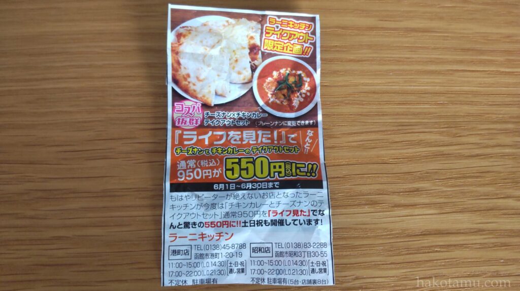函館市昭和3丁目ラーニキッチン昭和店 その5 「ライフを見た!」でなんと!!チーズナンセット通常 税込み 1,050円が650円 税込み に!! :函館無限1up。