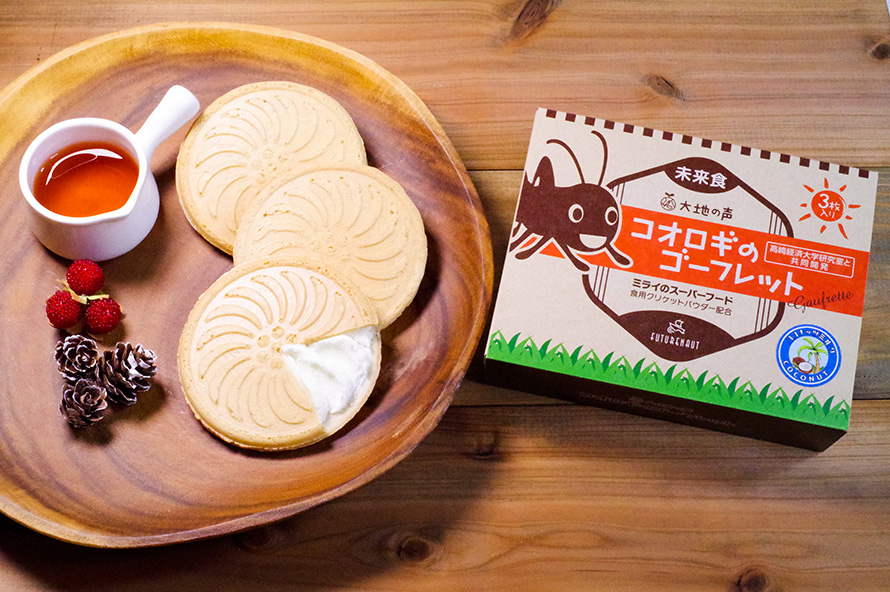 コオロギパウダーを使ったゴーフレット。昆虫由来食品を使ったお菓子です。FUTURENAUT株式会社 フューチャーノート 餌用・食用コオロギ の専門会社。