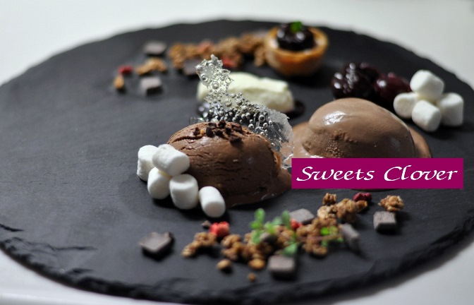 濃厚チョコレートアイスクリームをプレートパフェに盛り付けてみましたインターネットお菓子教室「Sweets Clover」。