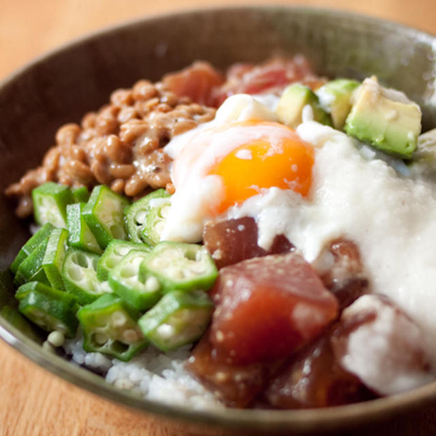 マグロの山かけ丼 ネバネバ食材をプラスしてさらに美味しく!レシピオリーブオイルをひとまわし。