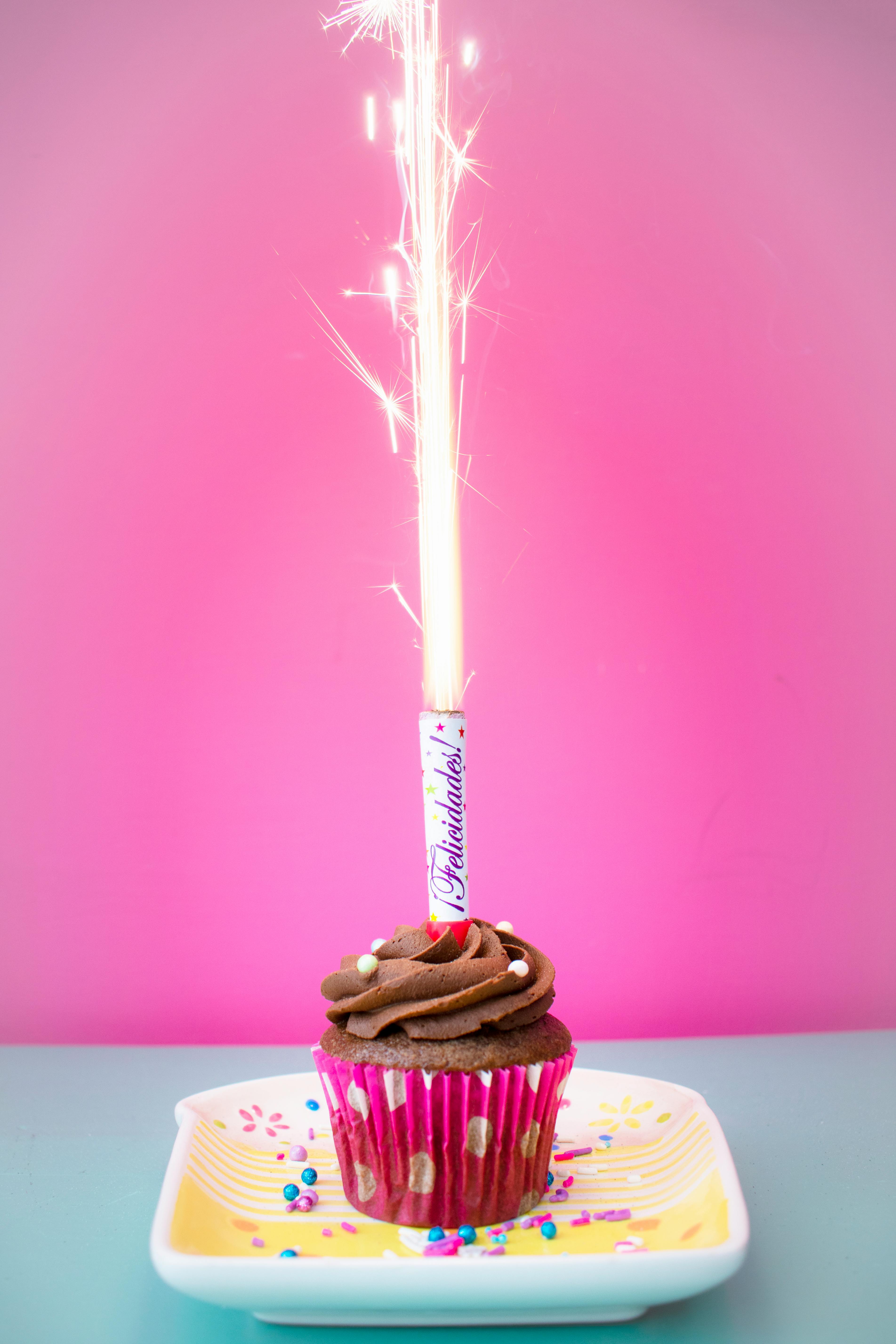 チョコレートのアイシングと線香花火のカップケーキ · 無料の写真素材。