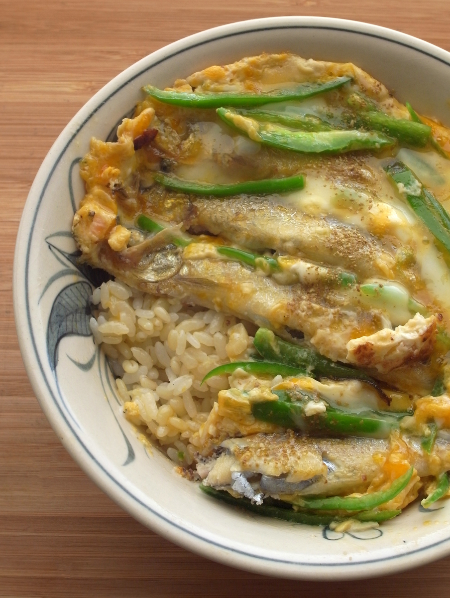 リメイク!ししゃもフライと小エビの卵とじ丼。